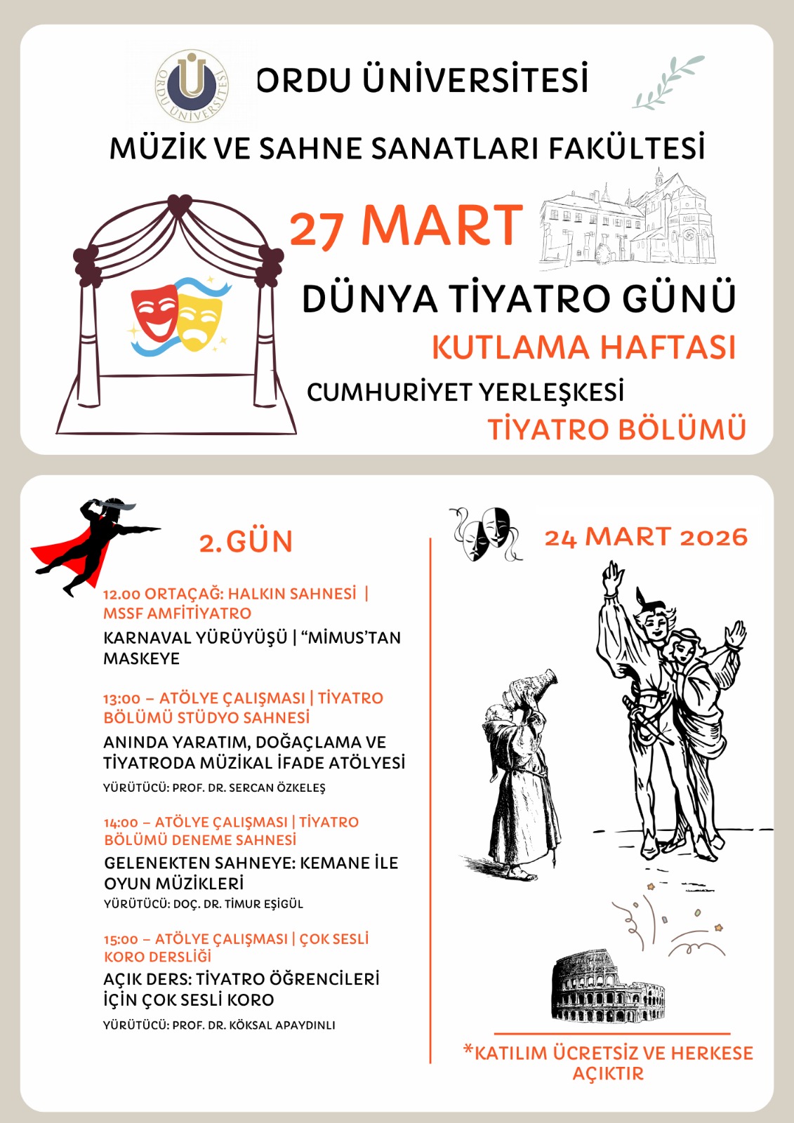 Etkinliklerin ikinci günü “Ortaçağ: Halkın Sahnesi” temasıyla devam edecek. Karnaval yürüyüşü ile başlayacak programda, doğaçlama, müzikal ifade, geleneksel oyun müzikleri ve çok sesli koro üzerine atölye çalışmaları gerçekleştirilecek. Katılımcılar, tiyatronun halkla buluştuğu bu dönemi deneyimleyerek öğrenme fırsatı bulacak.