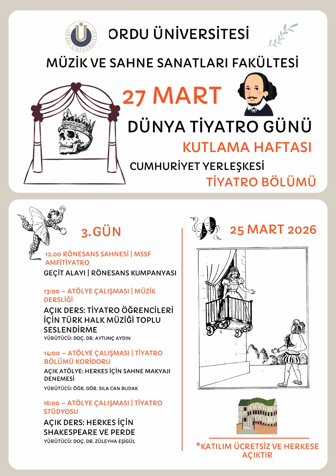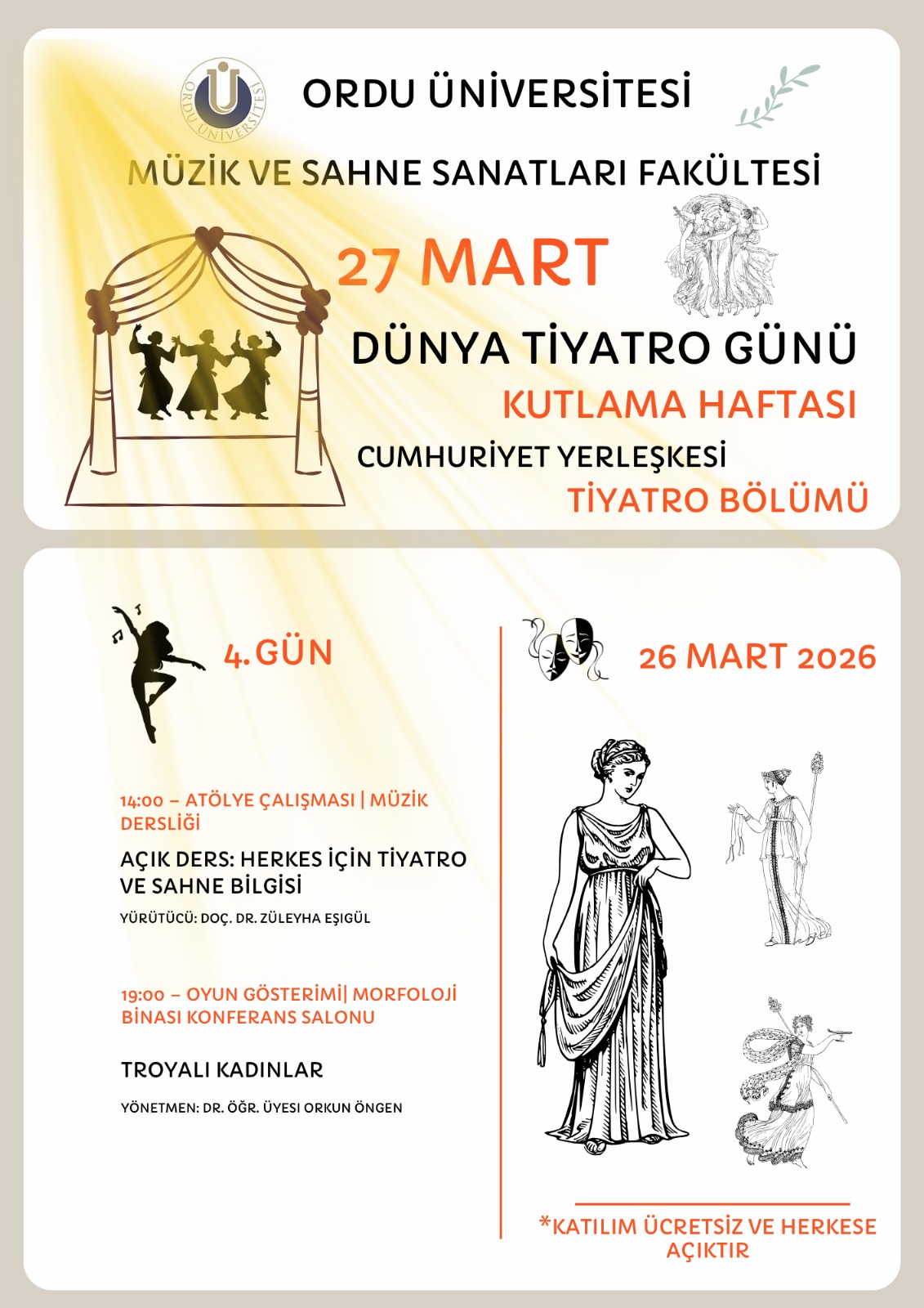 Üçüncü gün “Rönesans’tan Klasisizme” başlığı altında düzenlenecek etkinliklerde tematik geçit alayı, müzik çalışmaları, sahne makyajı uygulamaları ve doğaçlama temelli açık sahne etkinlikleri yer alacak. Dördüncü gün ise “Beden, İfade ve Sahne” temasıyla tiyatro ve sahne bilgisine yönelik açık derslerin yanı sıra sahne uygulamalarıyla zenginleşecek; gün, üçüncü sınıf tiyatro öğrencilerinin sahneleyeceği “Troyalı Kadınlar” adlı oyunla sona erecek.